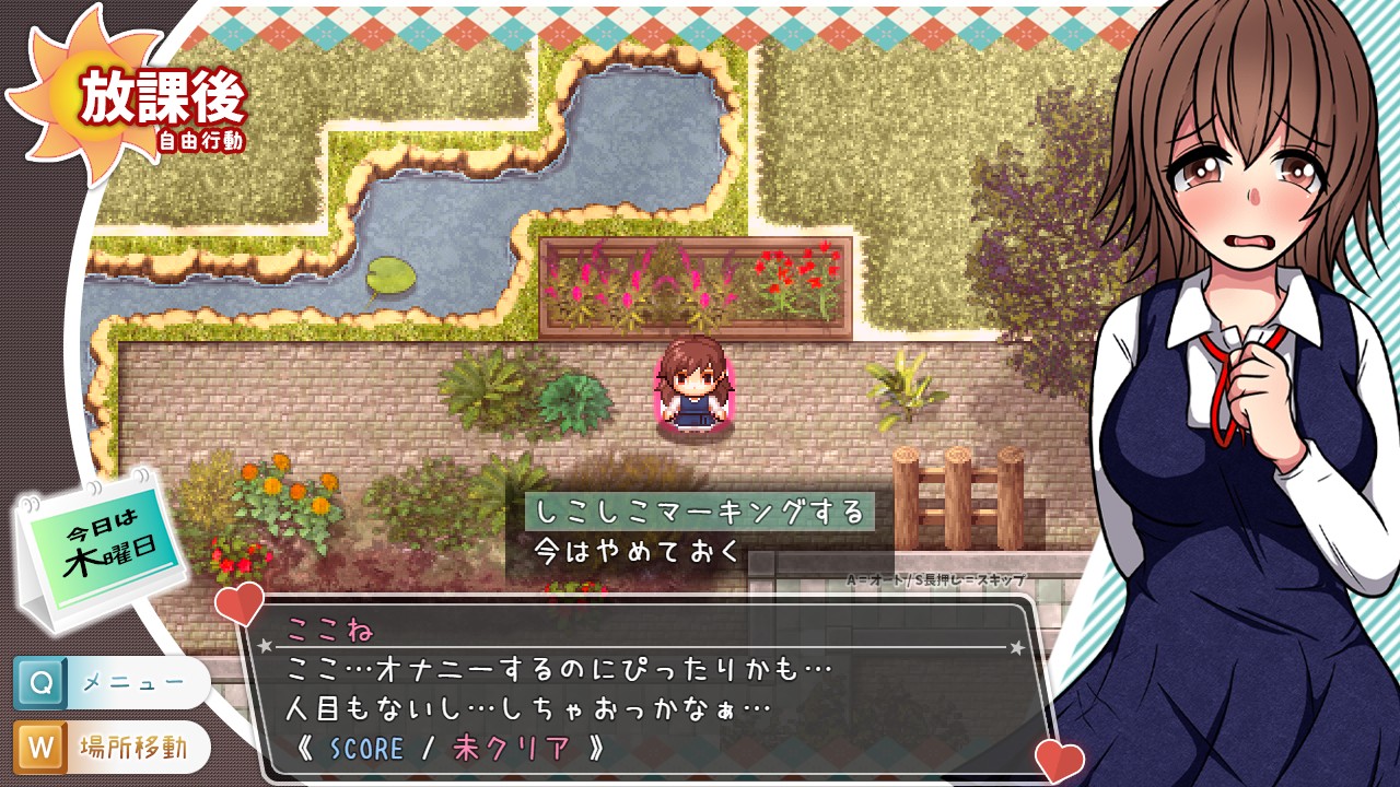 遊んでます!同人ゲームのツクール作品で戦闘が無いのも珍しいですがUIなどもオリジナリティーがあって新鮮です。画面のキャラがでかい(?)のも没入感が増しているような気がします。ここねちゃんのぽこちんドット絵も良く見えるしね笑。オナスポ探訪の名の通り、オナニーがメインなので誰かとヤるシーンは少なめ。バッドエンドでは輪姦されたり逆レイプしたりなど変わったシチュが楽しめます。またいつかふたなりモノのゲームを作ってください!
